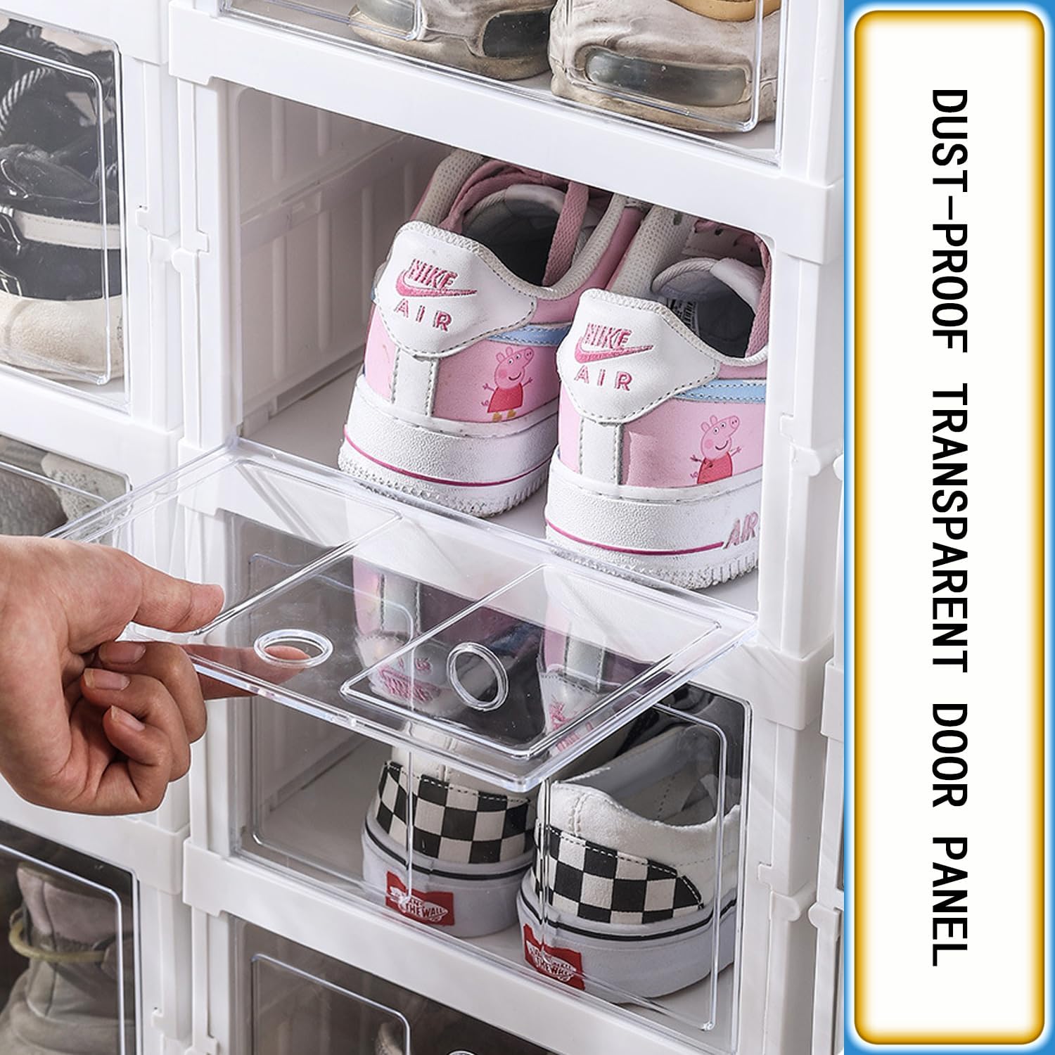 الباب الشفاف يوريك الأحذية كلها من غير ما تفتحي، وتقدري توصلي للزوج المطلوب بسرعة.