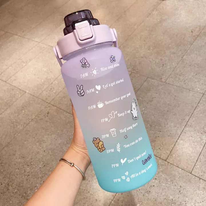 الماية مهمة في يومنا ومفيدة لبشرتنا بس بننسى نشرب طول اليوم وده بيأثر على صحتنا، عشان كدة لازم يبقي معاك دايمًا زجاجة الماية 2000 مل عليها رسومات وجمل شكلها حلو هتشجعك وتفكرك تشرب ماية كتير، خليها معاك في الجيم، الشغل، النادي وأي مكان.