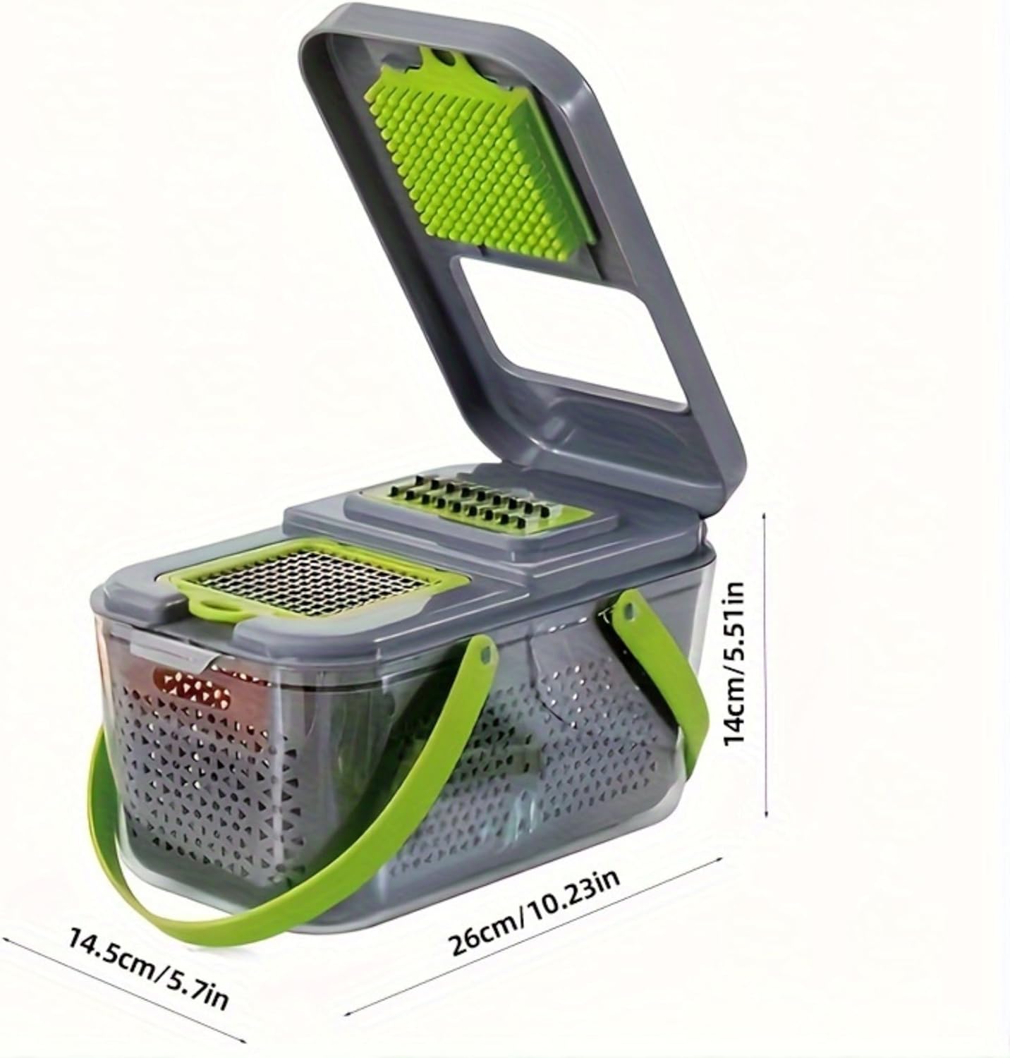 تحتوي على 11 شفرة مختلفة بأشكال متعددة لتقطيع، تقشير، بشر، وتزيين الخضار والفواكه بسهولة، بالإضافة إلى فرشاة تنظيف، مقشرة، وصندوق تخزين شفاف مدمج.
